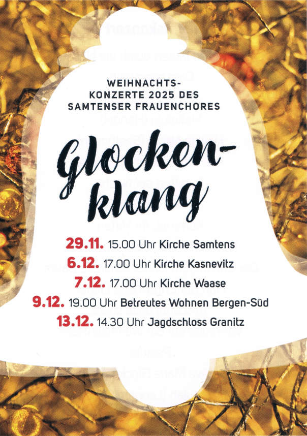 Rügens bekanntester und größter Frauenchor, der Samtenser Frauenchor, lädt zu seinen beliebten Adventskonzerten im Kerzenschein ein. Von traditionellen Weihnachtsliedern bis zum berühmten Halleluja von Händel oder dem ebenso bekannten Halleluja von Leonard Cohen nimmt der Chor die Zuhörer mit auf eine Reise durch Winter, Adventslichter und Weihnachtsstimmung unter dem Motto „Glockenklang“. Weitere Höhepunkte sind das „Ave Maria“ von Bach/Gounod oder „Vorfreude“ aus Drei Haselnüsse für Aschenbrödel, dazu kommen traditionelle alte Weihnachtslieder. Die klangvollen Lieder stellen eine Auswahl der schönsten Melodien aus 41 Jahren Chorgeschichte mit mehr als 300 Aufführungen im In- und Ausland dar.
